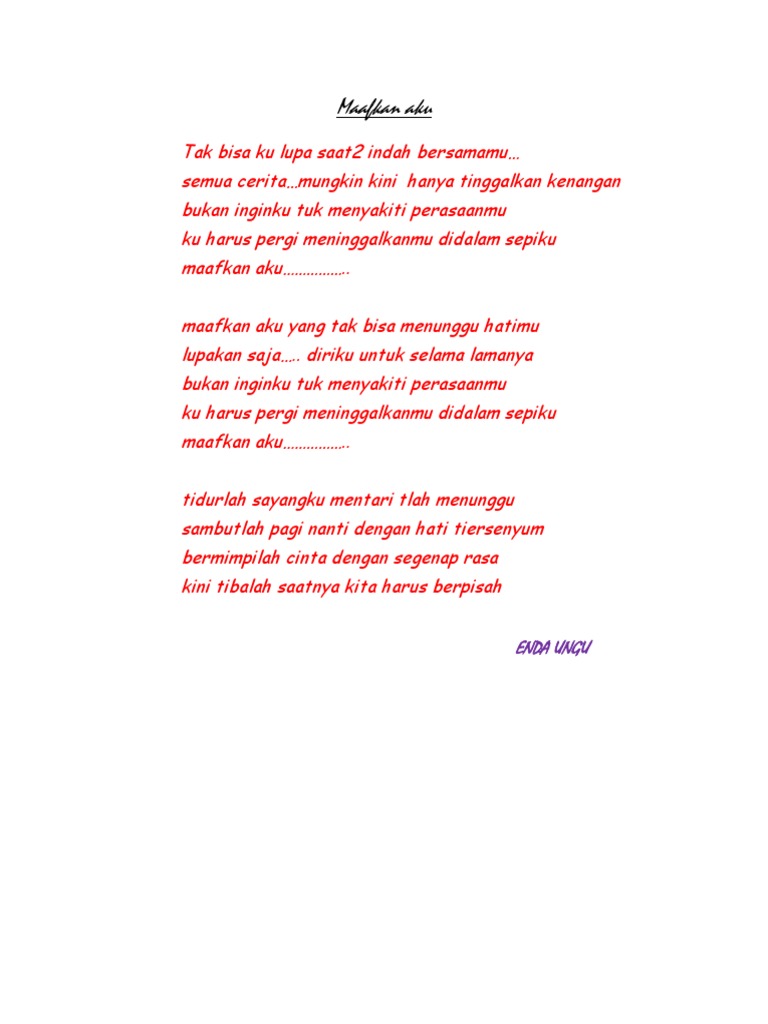 Semoga amal baik dan niat baik semuanya mendapat ridho Allah SWT. Meninggalkanmu di dalam sepiku. Lagu Maafkan Aku dipopulerkan oleh salah satu personel band Ungu Enda.