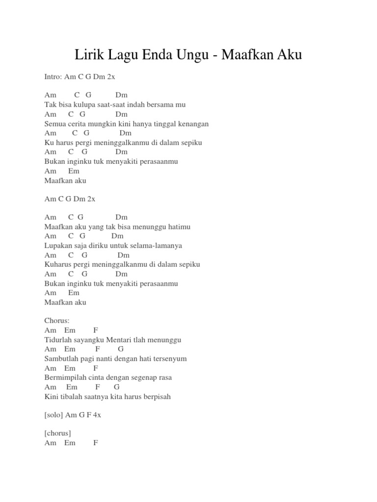 Lirik Lagu Maafkan Aku Enda Ungu Chord Gitar Maafkan Aku Enda Ungu. Semua cerita mungkin kini hanya tinggal kenangan. Lirik Lagu Aku Memang Jodohnya.